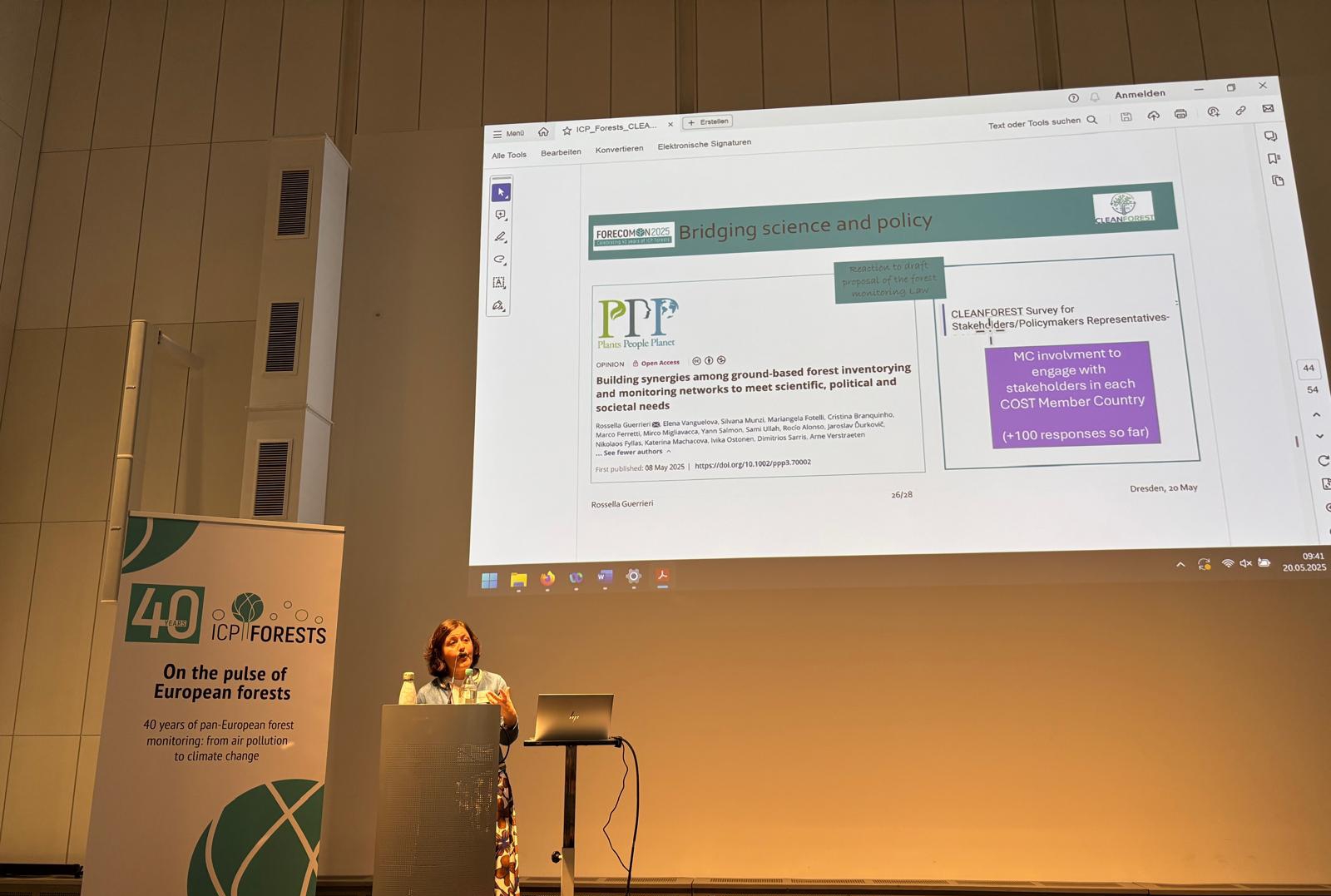 The Chair of the CLEANFOREST COST Action, Rossella Guerrieri, was invited to open the FORECOMON Conference 2025 – The 12th Forest Ecosystem Monitoring Conference, held in Dresden (Germany) on the 19-21 May 2025. The conference marked the 40th anniversary of the ICP Forests network. In her opening address, Rossella presented the Action to the community, highlighting the scientific advances achieved through the collaborative work carried out within each Working Group and led by WG core teams.